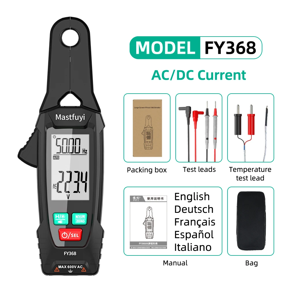 La pinza amperimétrica digital FY368 combina versatilidad y seguridad para profesionales y aficionados al bricolaje.Mide con precisión voltaje y corriente CA/CC, resistencia, capacitancia y temperatura.Las características clave de seguridad incluyen detección de corriente de fuga y detección de voltaje sin contacto (NCV), lo que le ayuda a identificar peligros potenciales de forma segura.La gran pantalla con retroiluminación garantiza lecturas claras en cualquier lugar.